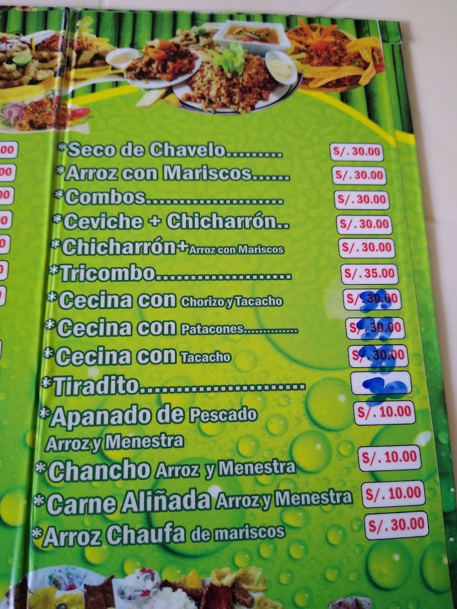Another favorite is the Seco de Chabelo Con Costillas de Chancho, a savory and flavorful stew made with pork ribs, seasoned with traditional Peruvian spices, providing a taste of local comfort food. For those seeking something with a little more indulgence, the Tacacho Y Patacones Chancho Y Chorizo S 30 00 is a dish filled with rich, savory pork, accompanied by crispy fried plantains, making for a satisfying and filling meal.